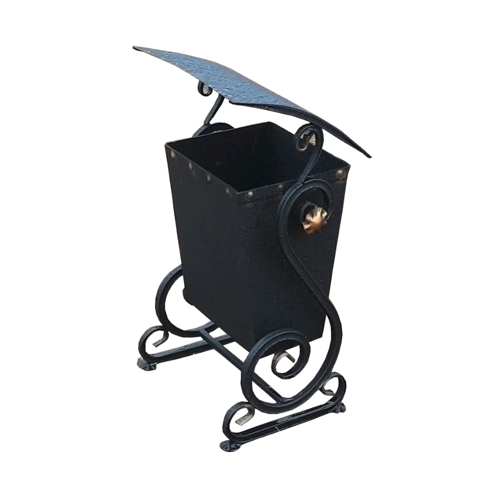 Имеет оригинальный дизайн урны с козырьком от осадков Способ установки стационарный, но с возможностью крепления анкерными болтами к поверхности установки Основной бак урны имеет систему опрокидывания, для более быстрой и легкой очистки от мусора Толщина стали мусорного бака 1,1 мм, с элементами художественной ковки Урна окрашена в классический черный цвет, после обработки грунтом