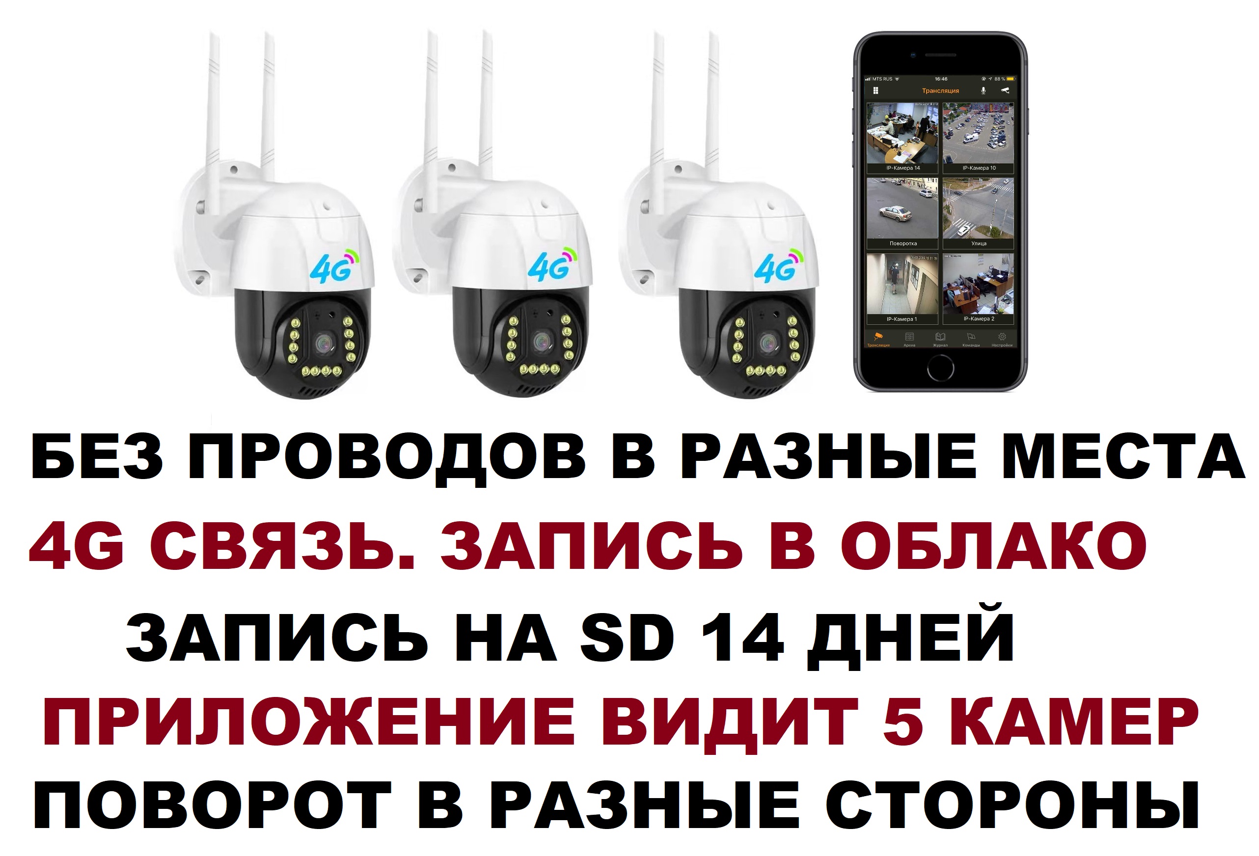 преимущество данного комплекта в том что, вам не нужно прокладывать никаких проводов, вам не нужны никакие видеорегистраторы, и вам не потребуется сеть wifi.